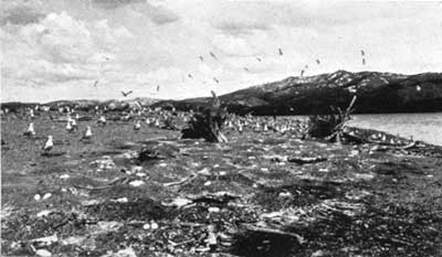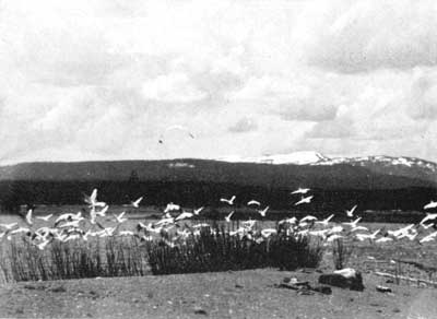 Figure 11. – Far down in the southeast arm of Yellowstone Lake the two tiny pelican islands lie. Not until our boat scrapes on the Island pebbles do the sitting pelicans decide to abandon their nests.