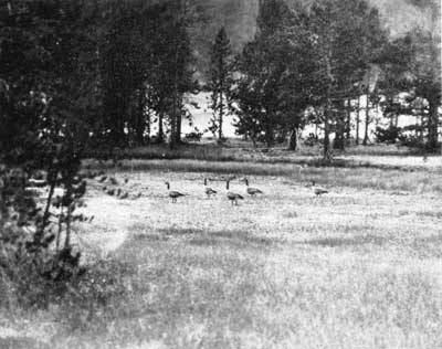 We had always maintained that this was one bird which would never consent to abide with man, but the summer of 1933 proved us wrong. All through the season two pairs of cranes each with a single young, fed unperturbedly in the meadows north of Fountain Geyser in full view of the constant procession of cars. On September 13, when last observed, the youngsters equaled their parents for size, though readily distinguishable by the reddish-brown streakiness of their bodies and the lack of color in the head markings. That same day we located a third family with two juveniles not more than a mile airline from the other two. It was a gala day indeed, for we felt that it marked Yellowstone’s high achievement in perpetuating the primitive in the presence of man.
