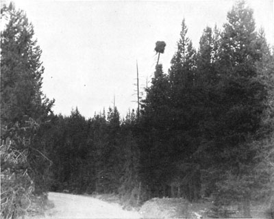Figure 12. – Osprey nest beside the highway. The ospreys of Yellowstone are evidence that even a very highly specialized and localized form can persist in the full vigor of the primitive in very close contact with man.