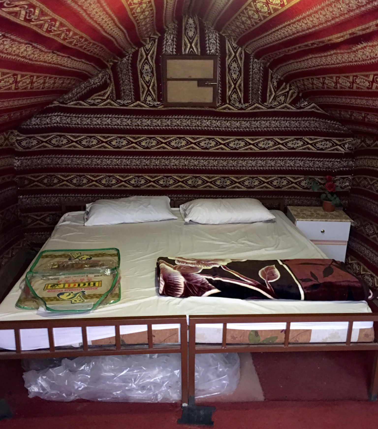 My tent is the one in the foreground on the left in the image above. Here is what it looked like inside. As you can see, it was not the sort of easily moveable tent the Bedouins would have taken from place to place in the desert only a few decades ago — there was even an electric light. But the textiles on the walls and ceiling nurtured a sense of tradition. (And to tell the truth, I did not mind having that light!)