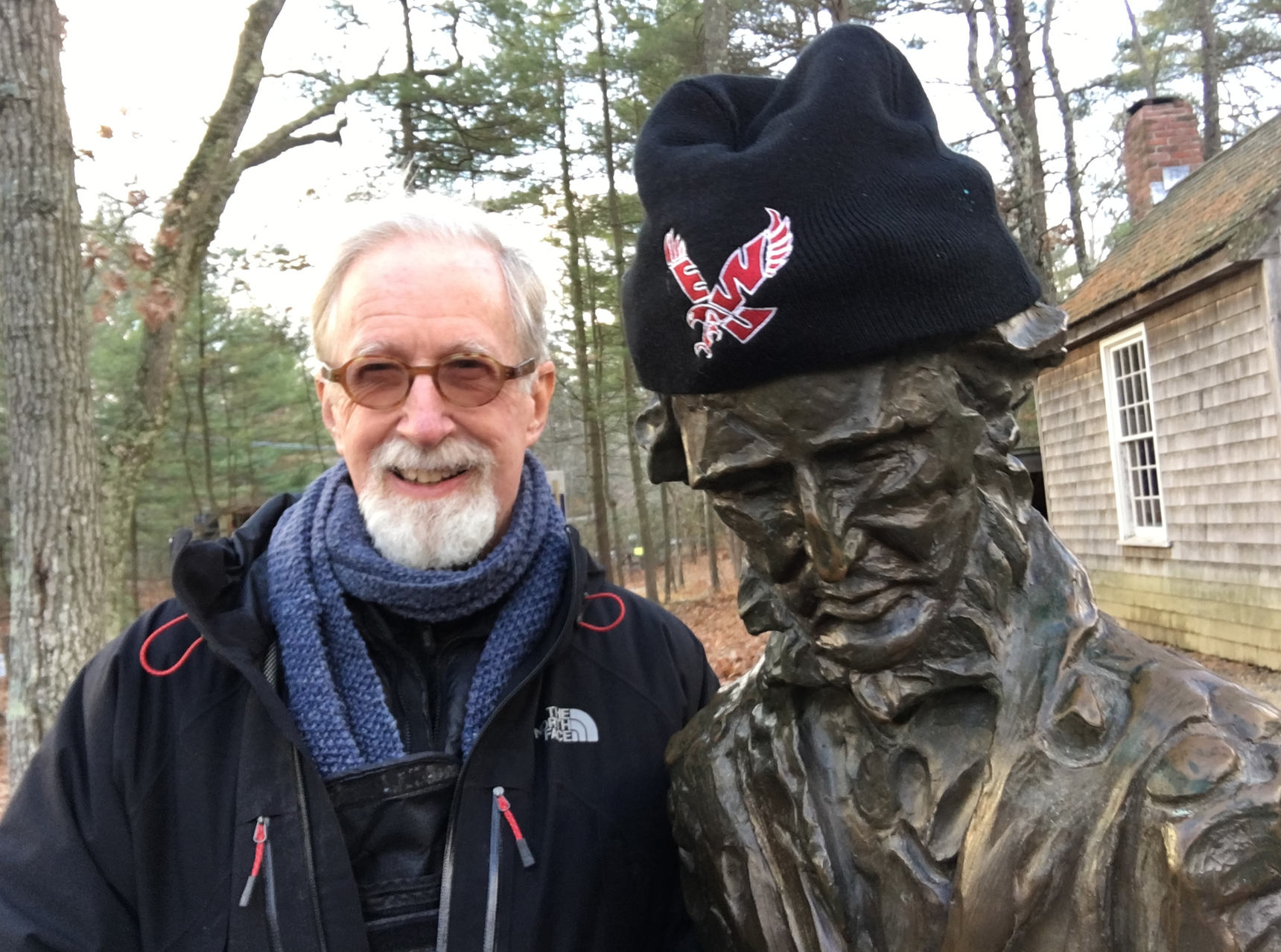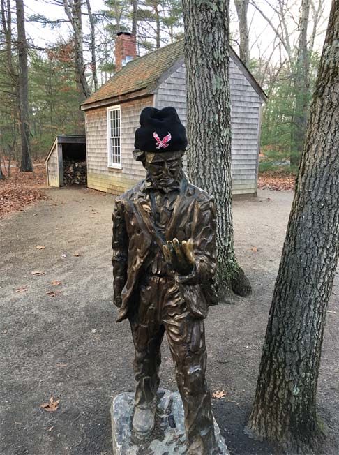 First I stopped by the replica of Thoreau’s cabin and visited with a nearby bronze statue of Thoreau. As it was cold, I leant him my hat, knowing after my many visits to Walden that he too is a fan of the Eagles.