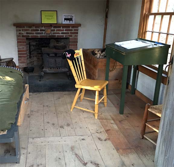 Inside the cabin are Thoreauvian furniture-replicas, carefully modeled on the actual furnishings of the cabin. Here is the desk where he worked on one of the most famous books in the English language: Walden: Or a Year in the Woods. One of the things I like about this replica is that since it is not all original materials, you can come in, sit on the bed, write in the guest book, and hang your hat on the chair. Don’t try that with original artifacts in a museum!