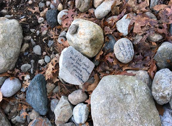 Sometimes visitors inscribe passages from Thoreau on the rocks they contribute to the pile. This one says “as if you could kill time without injuring eternity” — one of Thoreau’s most famous, and poignant, statements.
